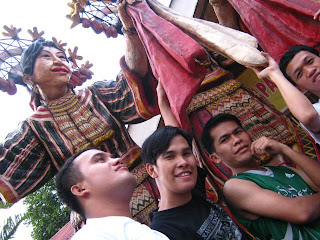 Of course, safety gears are a must before taking the rides. Michael Casinillo (above) poses before a list of "do's" and "dont's." Just a few seconds before their ride, Michael and Alain Nocete (below left) flash their most eager smiles. Yaaaaay! Look at their eyes! Tsk! Father Frank (below right), on the other hand shows us the length of this first ride ... that is, from one point to that beyond the building behind him. Fr. Rey Raluto gives the first batch of zip-line riders some words of encouragement. And off ... they went. Whew! Done in a few seconds! Next ride please!